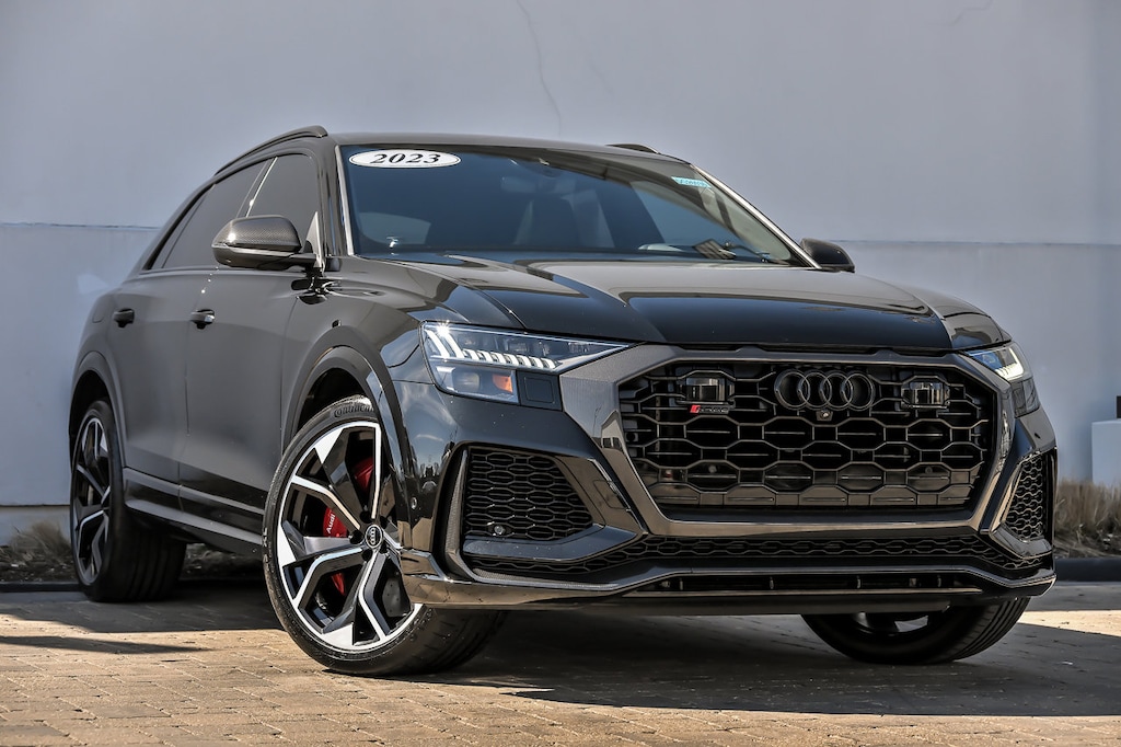 Mythos Black Metallic 2023 Audi RS Q8 4.0T quattro quattro 8-Speed Automatic with Tiptronic 4.0L V8 Turbocharged DOHC 32V LEV3-ULEV125 591hp, Black Dinamica Headliner, Black Mirror Housings, Black Optic Package, Black Roof Rails, Carbon Mask & Front Bumper Inlays, Carbon Mirror Housings, Carbon Optic Package, Carbon Rear Bumper Inlay, Carbon Rear Lighting Strip, Ceramic Brakes w/Red Calipers, Dual-Pane Acoustic Glass for Side Windows, Executive Package, Head-Up Display, Heated Rear Seats, Intersection Assist, Luxury Package, Massage Function for Front Seats, Power Soft-Closing Doors, Remote Park Assist Plus, Sport Exhaust System w/Black Tips, Traffic Sign Recognition, Wheels: 23" Audi Sport 5 Y-Spoke Rotor Design.